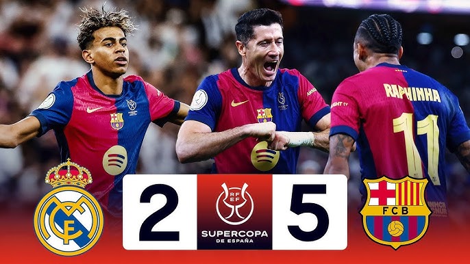 Demostrando una gran superioridad, el Barça ganó la Supercopa de España, venciendo al Real Madrid por 2 a 5. La final empezó con un gol del madridista Mbappé a los cinco minutos de juego. El empate azulgrana no tardó en llegar gracias a un gran gol de Lamine Yamal, y unos minutos después Lewandowski marcó desde los nueve metros tras la corrección del VAR al árbitro. En esta primera parte de la final, los jugadores azulgranas no pararon de crear ocasiones, y Raphinha y Balde aprovecharon las suyas para marcar y dejar el marcador en un 1 a 4 antes del descanso.